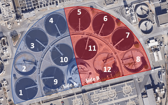 Initial field testing to support the CFD model development occurred in October 2014 and included stress testing, determining sludge settleability and flocculation kinetics, and dye studies. The clarifiers were subjected to a range of surface overflow rates (SOR) over the testing period. Effluent quality did not experience a dramatic decline despite higher flow rates during stress testing. The design peak SOR of the secondary clarifiers, assuming all units in service, is 910 gpd/ft2. SORs higher than design peak were sustained during stress testing for both the A and B sides; the average effluent total suspended solids during stressed conditions was 22 mg/L and 20 mg/L for A side and B side, respectively.