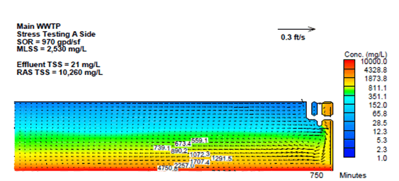 Based on field testing results Hazen developed a 2Dc model of the 12 PFPO secondary clarifiers. The CFD model validation and calibration indicated the presence of strong density currents in the clarifiers as noted in field observations. The existing skirt baffle is too short to control the density currents within the clarifier. CFD model analysis indicated that the optimal skirt baffle length is 30-inches below the bottom of the effluent trough.