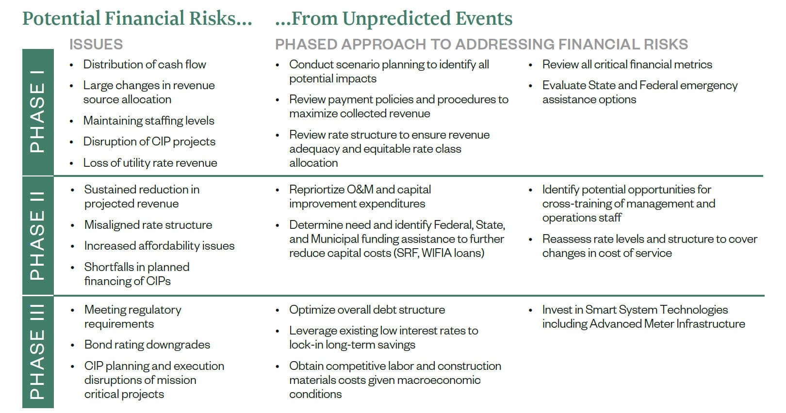 The pandemic has heightened the need for utilities to identify potential vulnerabilities to their long-term financial health and develop strategies to manage those risks. By taking a phased approach in addressing financial risks, utilities can improve resiliency, weather the COVID-19 pandemic, and cope with other unforeseen disruptive events that may occur in the future.