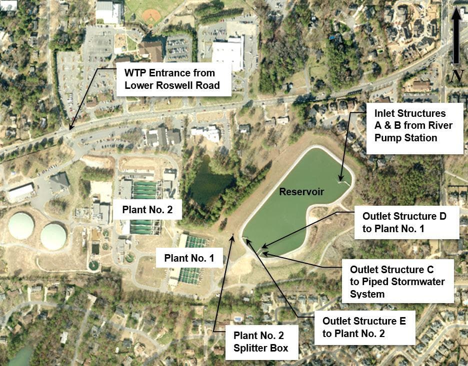The dam was originally constructed in the early 1950s to serve as the raw water storage reservoir for the James E. Quarles WTP in southeast Cobb County, Georgia. The structure is a ring-shaped earthen embankment that ranges from 10-ft to 35-ft tall, and receives inflow from a pump station on the Chattahoochee River. The dam was classified as a High Hazard structure by the Georgia Safe Dams Program (GSDP) in September 2012. Dam improvements are required to bring the structure into compliance with the GSDP guidelines.