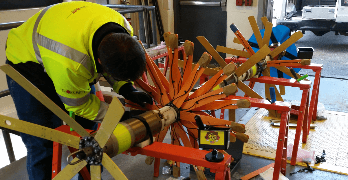 Hazen subcontracted with Pure Technologies and assisted TOSA in developing scope and obtaining bids to hire an underwater dive company TNJ Marine, who was needed to assist with the assessment in inserting and obtaining the PipeDiver tool underwater in beach manhole and offshore. While it was known that the 2,000 feet of offshore pipeline was made of steel pipe, there was no definitive information on the 4,000 feet of onshore pipeline material. To make sure the right equipment was used, two models of the PipeDiver tool (a 24-detector tool for steel and a six-detector tool for PCCP) were brought on site, assembled and balanced.