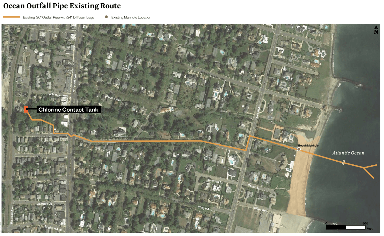 The Township of Ocean Sewerage Authority’s (TOSA’s) 36-inch diameter ocean outfall is a single conduit for conveying treated effluent from the wastewater treatment plant’s chlorine contact tank to its discharge point in the Atlantic Ocean. Starting at the plant’s chlorine contact tank outlet, the approximately 6,000-foot pipeline runs generally east, approximately 4,000 feet to a drop connection beach manhole installed on the shoreline. The outfall then extends into the ocean, terminating approximately 2,000 feet offshore.
