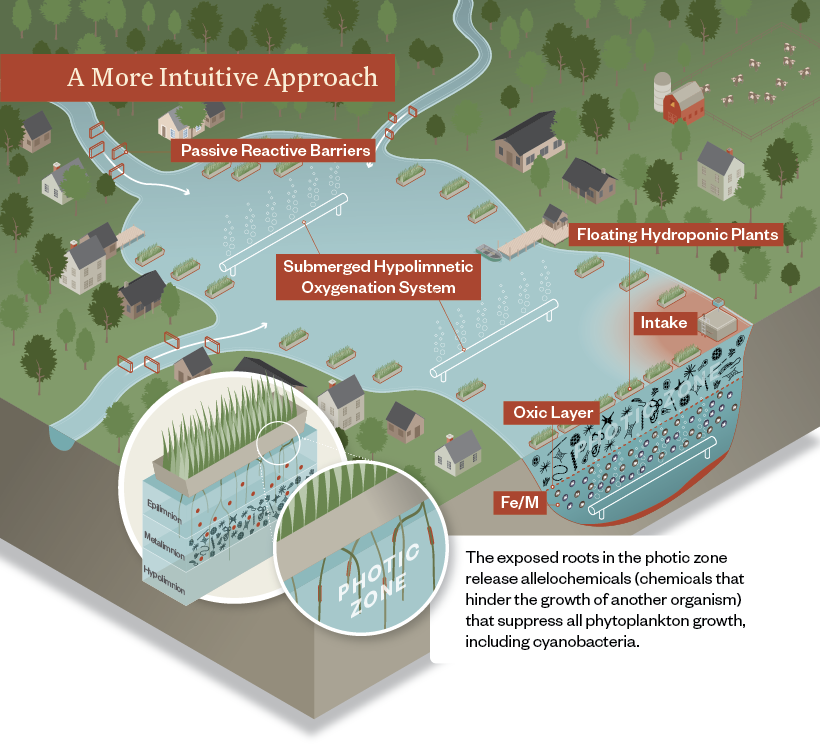 This approach attempts to reestablish a balanced ecosystem by using natural purification processes that not only mitigate cyanobacteria related issues, but also increase overall water quality, especially with respect to emerging contaminants.