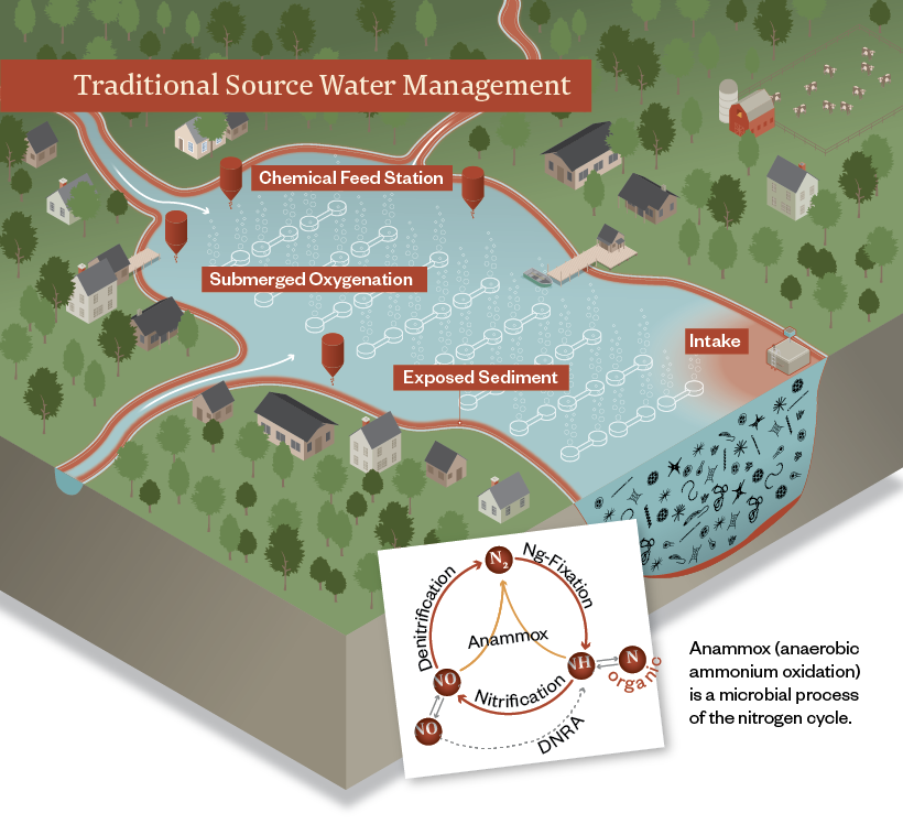 Typical source water management consists of chemical feed stations and oxygenation/aeration with the intent of mixing and destratification. These management programs fail to restore the banks of the tributaries and the littoral zone of the source water, key factors needed to promote primary consumers and allow nutrients and energy to flow up the food chain and promote nutrient removal. The amount of oxygenation/aeration is usually excessive, and the aim is to promote aerobic respiration, which is only one segment of a metabolic pathway. This only accounts for one of the many metabolic pathways that are present at the sediment-water interface.