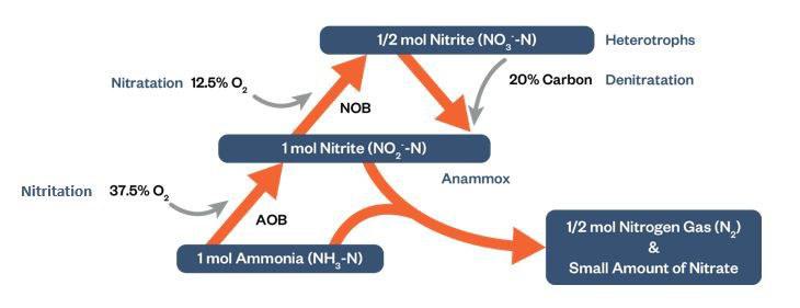 In total, this novel process has the ability to remove up to 90% of the total inorganic nitrogen from centrate and primary effluent without the need for NOB suppression, while using 50% less energy and 75% less carbon than conventional BNR processes.