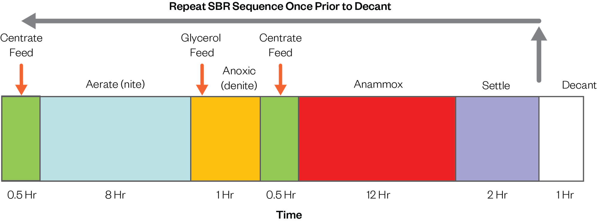 SBR tests consisted of two configurations: 1) A step feed configuration, which included two separate ammonia (centrate) feed; and 2) a MLE type configuration which had only one initial ammonia feed interval. The step feed configuration relied on complete nitrification of the initial centrate feed to produce nitrate that would then be converted to nitrite via the GAB activity to match the ammonia present in the second centrate addition (eg. 1 (NO2): 0.7 (NH3)) for optimal deammonification. The MLE configuration partially nitrified the full ammonia load at the beginning of the cycle, which required proper sequence timing and DO control to optimize the fraction of ammonia nitrified and then denitrified via the GAB, while allowing adequate residual ammonia for the anammox sequence. In both scenarios, the nitrate produced during aeration was converted to nitrite via glycerol addition. The dose of glycerol needed to achieve optimal TN removal (e.g. COD added/TN removed) was a primary process control variable.