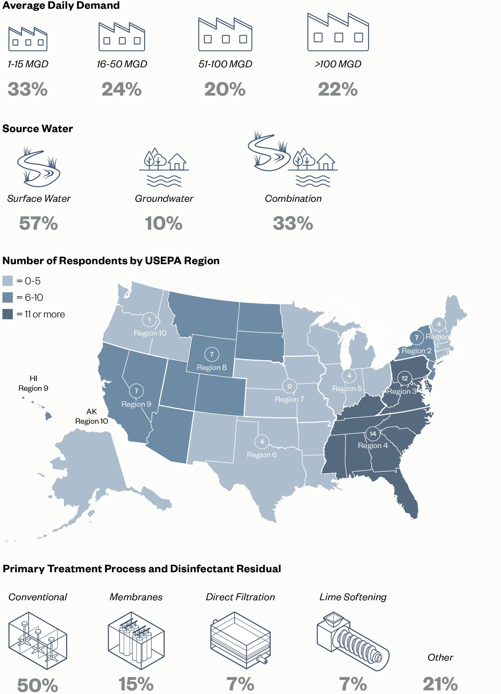To gauge current industry practices and trends related to corrosion control and LCR compliance, a utility survey was performed in March 2019. Survey responses were received from a diverse group of utilities nationwide with different sizes, source waters, and treatment processes. Survey questions were included to gauge utility challenges, concerns, and priorities related to LCR compliance and corrosion control treatment.