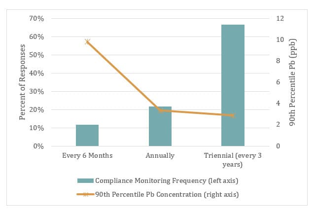 Approximately 67% of systems participating in the survey collect LCR samples every 3 years, with reported lead levels the lowest in these systems. Consistent with LCR requirements to return to standard monitoring every 6 months following an Action Level exceedance, the reported 90th percentile lead concentrations were higher in systems collecting tap samples every 6 months.