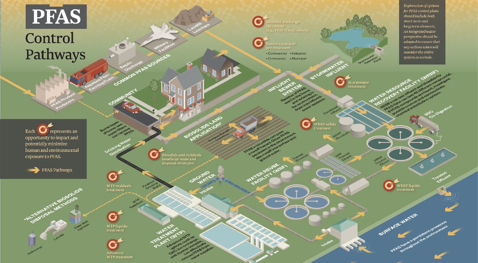 Exploration of options for PFAS control plans should include both short-term and long-term elements. An integrated water perspective should be adopted to ensure that any actions taken will consider the entire system as a whole. Short-term plans will aim to meet existing requirements for treatment and public disclosure, and long-term plans will likely include elements such as identifying and controlling sources, cost-effective treatment options, and possible public communications campaigns.