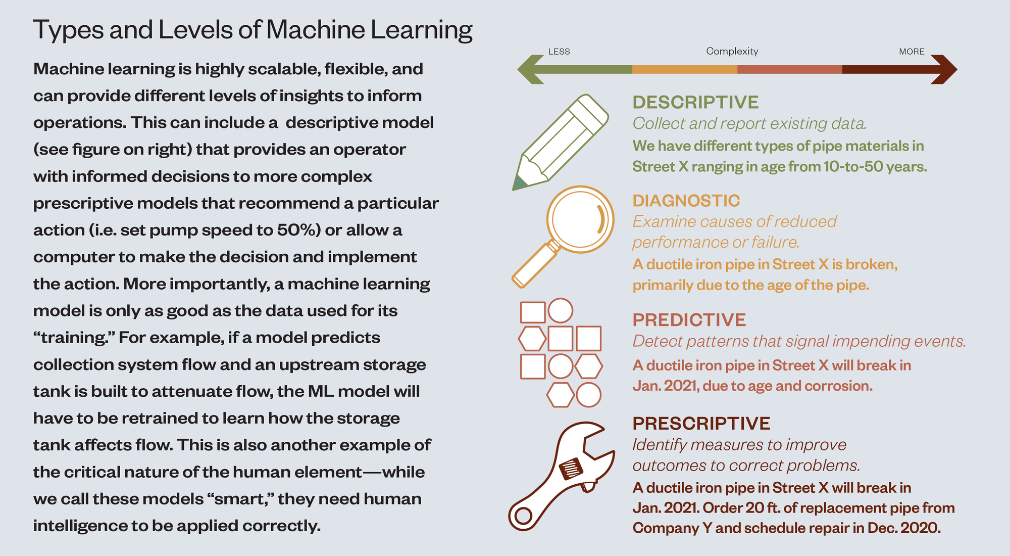 In one specific application, we used the Azure Security Center with multiple firewalls for Raleigh Water to establish trusted communications and provide a robust security framework. Data that is stored on an Azure SQL server must then connect to a program like Azure data management tools to perform all the activities related to preparing the data for the model. A program like Azure machine learning tools can be used for training (if not already completed) and model execution, retraining, and scoring. This entire process is known as an automated data pipeline because once configured, and it runs continuously without human intervention.