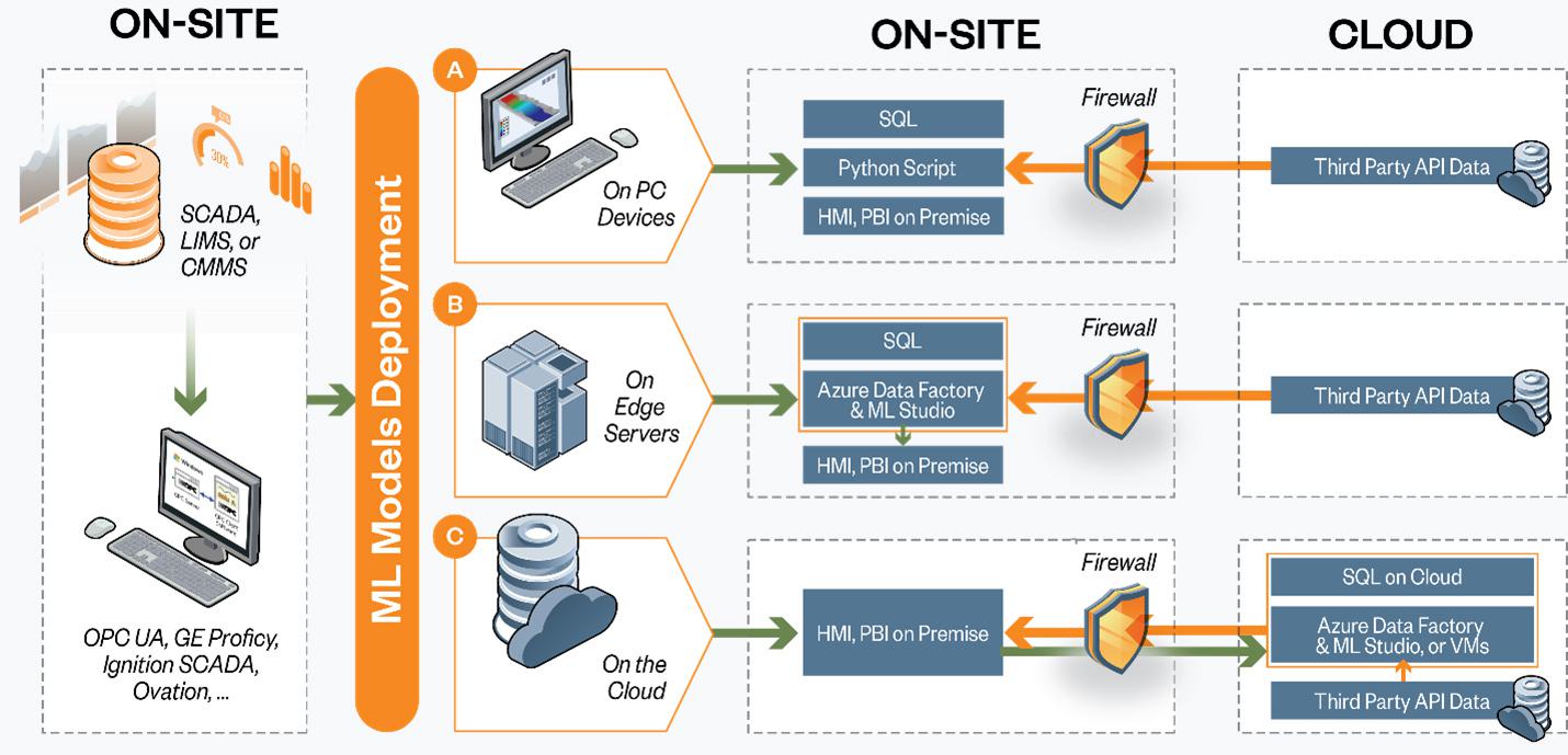 The components of deploying a model generally include training, real-time data connectivity, data storage, data transformation, model execution, model retraining, and scoring. Once a model is trained (either on a desktop or in the cloud), real-time feeds of data can be established using tools such as GE Proficy or Ovation. Secure on-premises connectivity tools can then be used to push the data from a utility’s business network to Azure SQL or similar database.