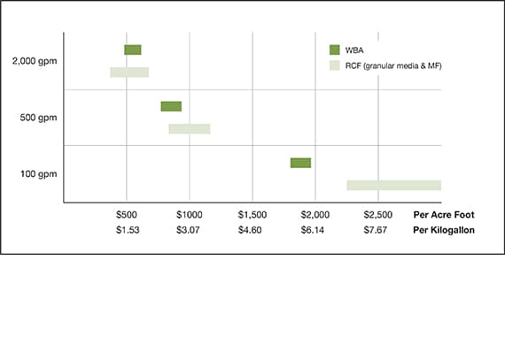 A comparison of the estimated annualized costs of the WBA and RCF technologies. Costs are for 100% utilization of treatment and the range reflects potential treatment goals of 1 ppb (high end) to 25 ppb (low end).