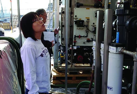 Ying Wu of Hazen and Sawyer inspecting a microfiltration (MF) unit tested as part of the RCF process.