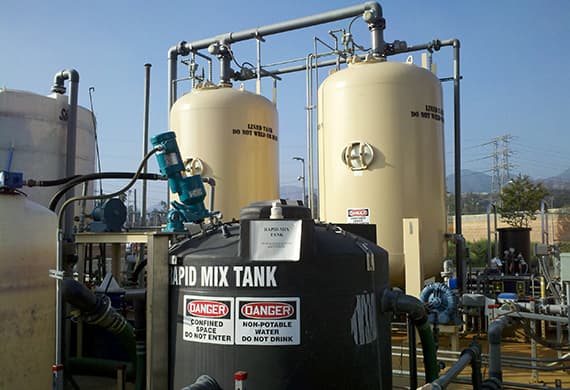 Reduction/Coagulation/Filtration (RCF) treatment process showing the pressure filters in the background and rapid mix tank for coagulation (100gpm). Components not shown include reduction tanks and aeration.
