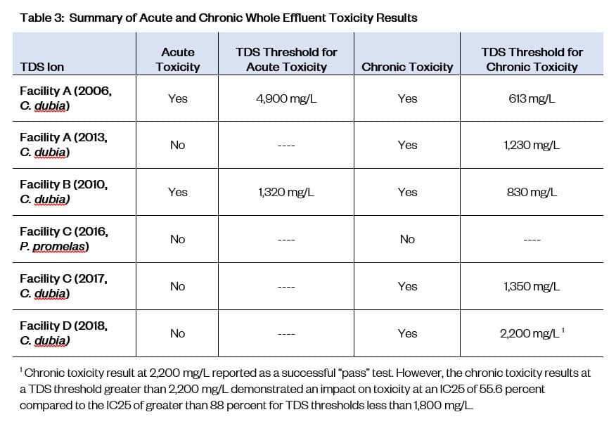 Table 3 summarizes the acute and chronic WET test results for each of the four case studies. Two of the four facilities demonstrated acute toxicity with respect to TDS. All four facilities demonstrated varying thresholds of chronic toxicity with respect to TDS. In one case, Facility D passed all of the chronic tests in the spiked TDS matrix with a TDS of 2,200 mg/L. However, the chronic toxicity test at 2,200 mg/L did demonstrate an impact on toxicity at an IC25 of 55.6 percent compared to the IC25 of greater than 88 percent for TDS matrix spikes less than 1,800 mg/L.