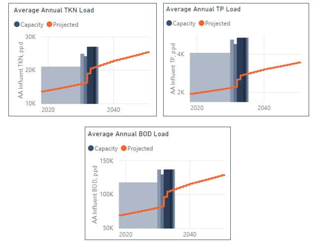 The timing of infrastructure implementation is primarily driven by increasing flows and loads to the NCPCP. Therefore, it is necessary to identify the optimal time to begin construction such that enough capacity is maintained at the NCPCP. A Power BI dashboard was designed such that triggers may be modified to instantaneously visualize how infrastructure implementation may change. For example, increasing the rate of change in flows or loads would require an earlier start date for construction.