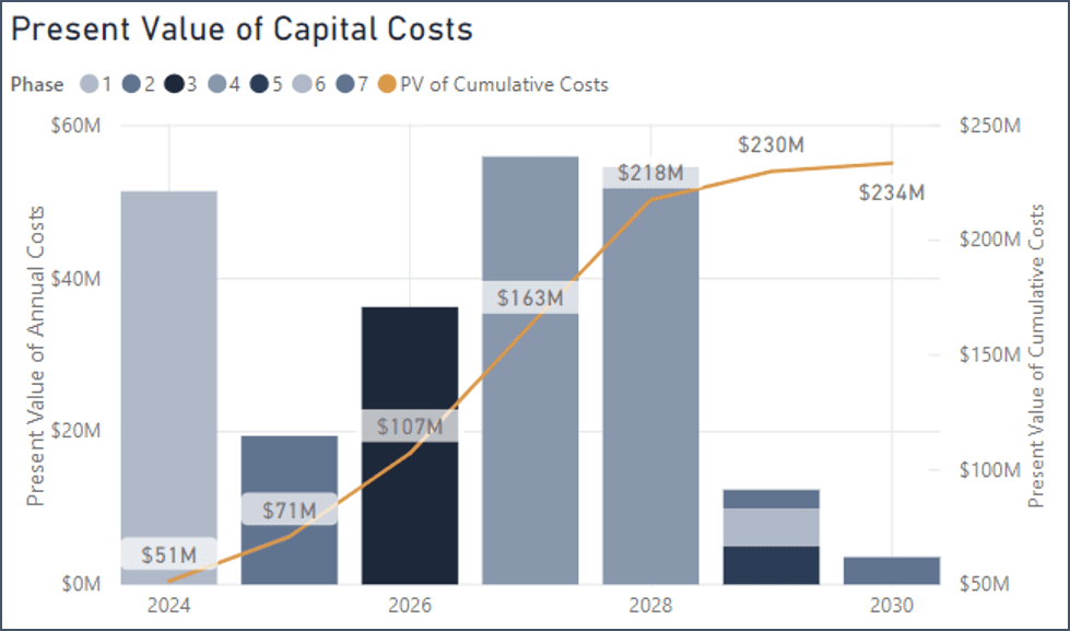 In conclusion, this tool provides the ability to dynamically quantify the financial costs and benefits of deferring major capital investments, optimize financial metrics by varying project timing and components for capital investment scenarios, and is easily updatable to adapt to future conditions.
