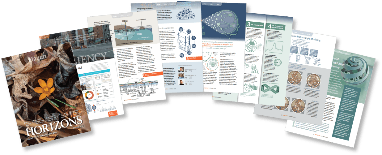 Horizons showcases significant water, wastewater, reuse, and stormwater projects and innovations that help our clients to achieve their goals, and can help you achieve yours. Articles are written by top engineers and process group leaders, demonstrating and explaining the beneficial application of a variety of technologies and tools.