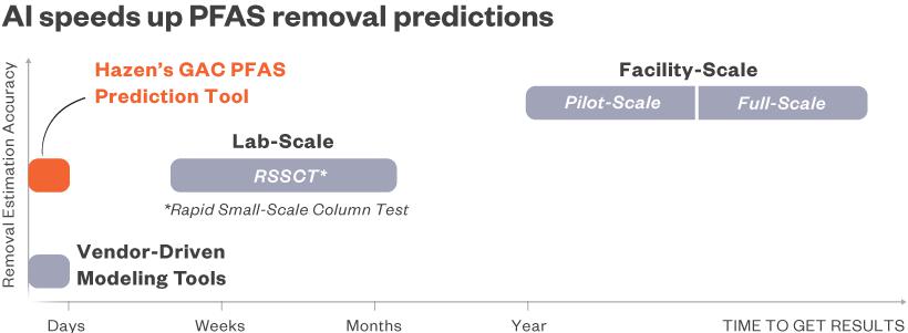 Utilities interested in granular activated carbon (GAC) for PFAS removal want to know how well the technology will work for them. GAC vendors sometimes offer estimates, but those can be unreliable. Lab tests are more accurate but can take months. Onsite testing (most accurate) can take years. Hazen GAC’s machine learning model can predict PFAS removal performance in days, producing estimates that rival the accuracy of lab tests while shaving months off of the decision-making process.