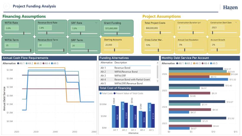 Hazen designed a Microsoft Power BI dashboard to help the City of Sanford and neighboring municipalities weigh the many factors that could influence the costs of a new regional drinking water treatment plant. The above screenshot shows just a few of those variables—for example, potential bond rates for loans, grant funding won, and the duration of the plant’s construction.