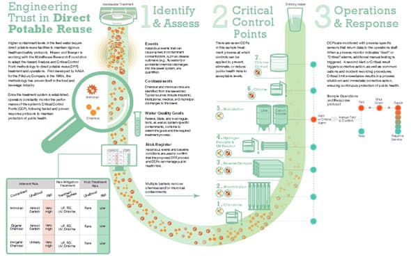 The paper describes the application of the Hazard Analysis and Critical Control Point (HACCP) methodology to identity and assess the reliability of critical control points and critical monitors to manage acute and chronic health risks in potable reuse treatment trains. Specifically, a failure analysis was performed for full-scale ultrafiltration and reverse osmosis critical control points to determine the reliability of critical monitors and their associated impacts on finished water quality.