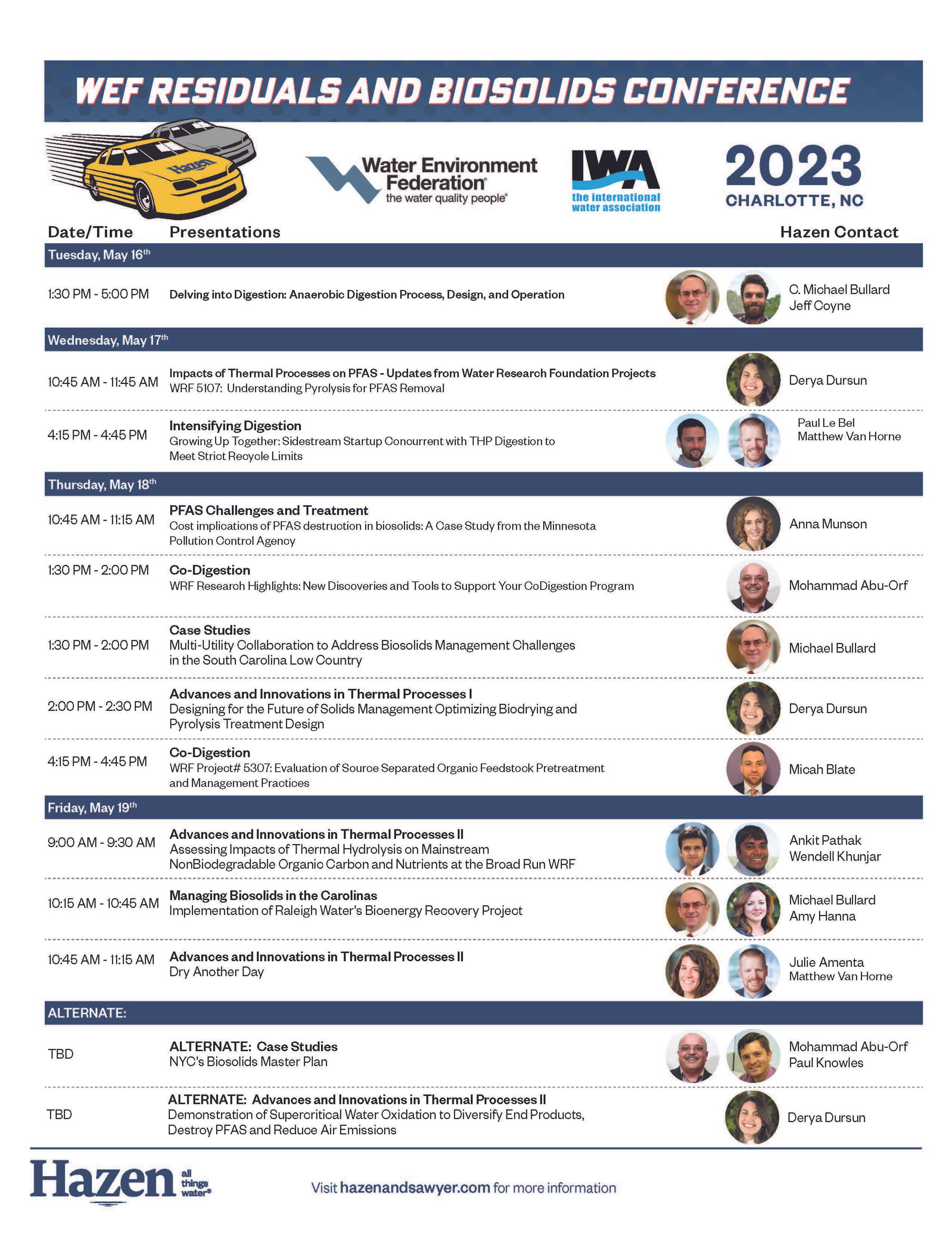(RALEIGH, NC - May 1, 2023) - Hazen and Sawyer engineers and scientists will present 11 sessions (with two alternates) at the 2023 WEF/IWA Biosolids and Residuals Conference, which is being held May 16-19, 2023 in Charlotte, NC.