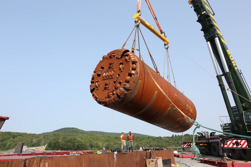 The 9.5-foot-diameter tunneling machine began its work in 2017. The tunnel was excavated in two segments, both starting at a 185-foot-deep shaft located alongside State Route 990V. The first leg of the tunnel stretched 1,188 feet from the shaft to the eastern bank of Schoharie Creek. The second leg measured 930 feet from the shaft to the bottom of Schoharie Reservoir, where the MTBM excavated through the reservoir bottom on January 19. After the winter ice melted, engineers set up a system of barges and lifts to remove the MTBM from the water on Wednesday. The entire tunneling effort was unique – it was one of the largest excavations ever by an MTBM that included a deep-water retrieval of the machine.