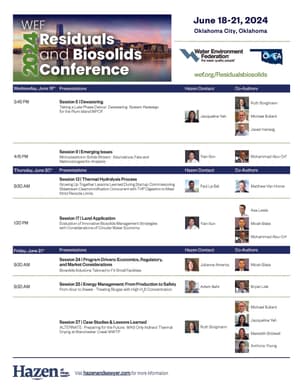 (DALLAS, TX – June 5, 2024) - Hazen experts will present six technical sessions (and one alternate) at the upcoming 2024 WEF/IWA Biosolids and Residuals Conference, being held June 18-21 in Oklahoma City, OK.