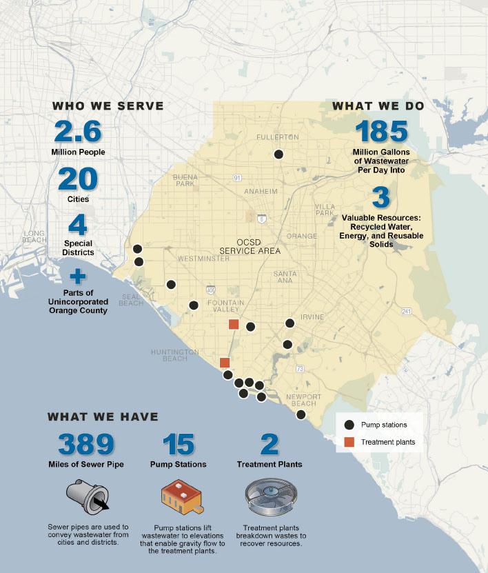 Orange County Sanitation District (OCSD)’s 479-square mile service area includes 396 miles of regional trunk sewers. Although all influent reaches the plants by gravity flow, 15 off-site lift pump stations are needed.