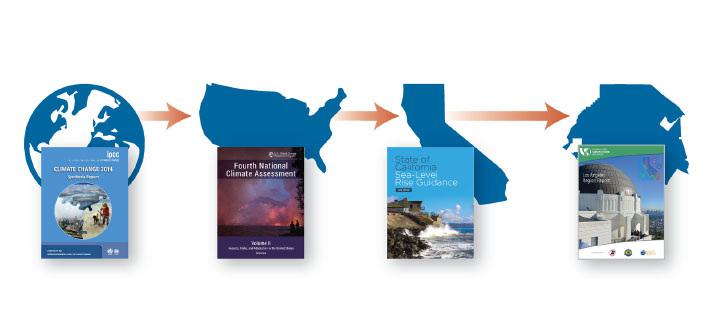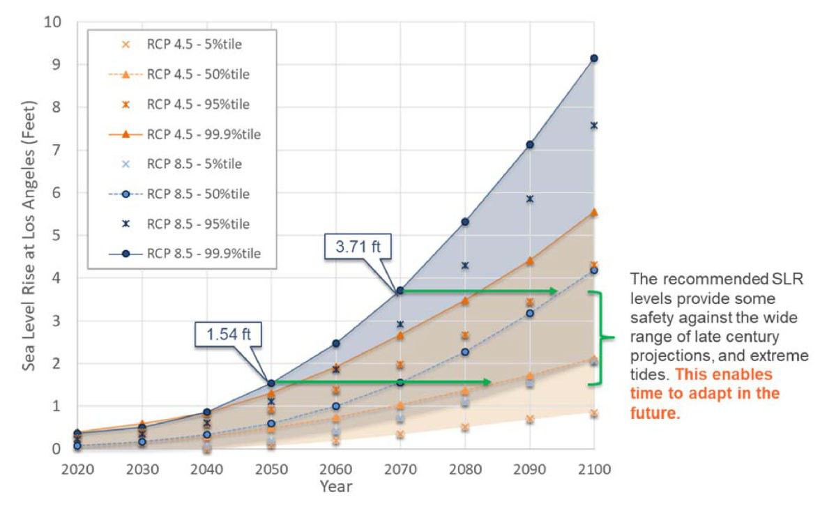 Sea Level Rise (SLR) projections for the Los Angeles region from California’s Fourth Assessment Report is used in the climate resiliency study.