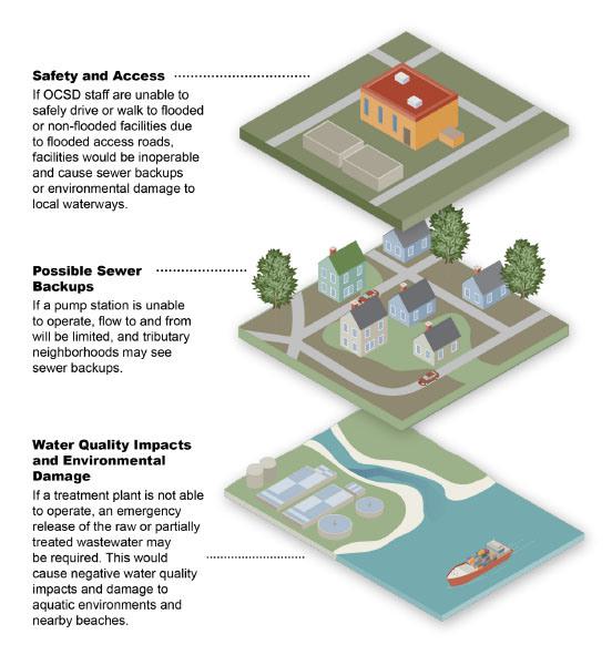 Impacts of flooding and tsunami on OCSD infrastructure include electrical or mechanical failure and unsafe conditions for operators and facility staff.