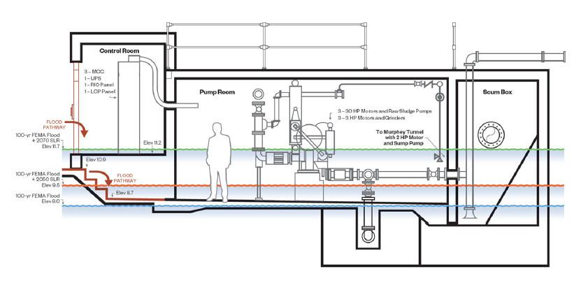 Flood pathways were identified for impacted building at OCSD’s Treatment Plant No. 2. Detailed cross-sections of impacted facilities and elevation of key assets were created to communicate the relationship between flood pathways and potentially impacted assets within those facilities.
