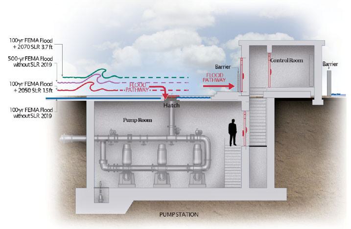An example of facility level adaptation for a typical pump station that was considered in the study. Flood levels and flood pathways to the structure were considered in adaptation planning.