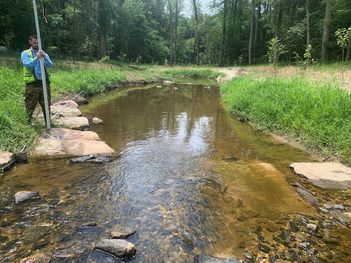 Hazen’s Paul Le Bel monitoring in Richmond, Va. Post-construction documentation for stream restoration projects is a critical aspect of verifying success.