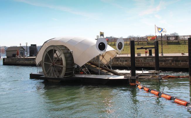 To assist in collection of litter and debris flowing down the Jones Falls River into the Baltimore Harbor, the City and the Waterfront Partnership of Baltimore use the Inner Harbor Water Wheel. Also known as "Mr. Trash Wheel," the water wheel uses the river’s current to provide power to lift trash and debris from the water and collect it into a dumpster barge. The trash wheel contributes to public outreach efforts through the use of social media. (Source: Waterfront Partnership of Baltimore)