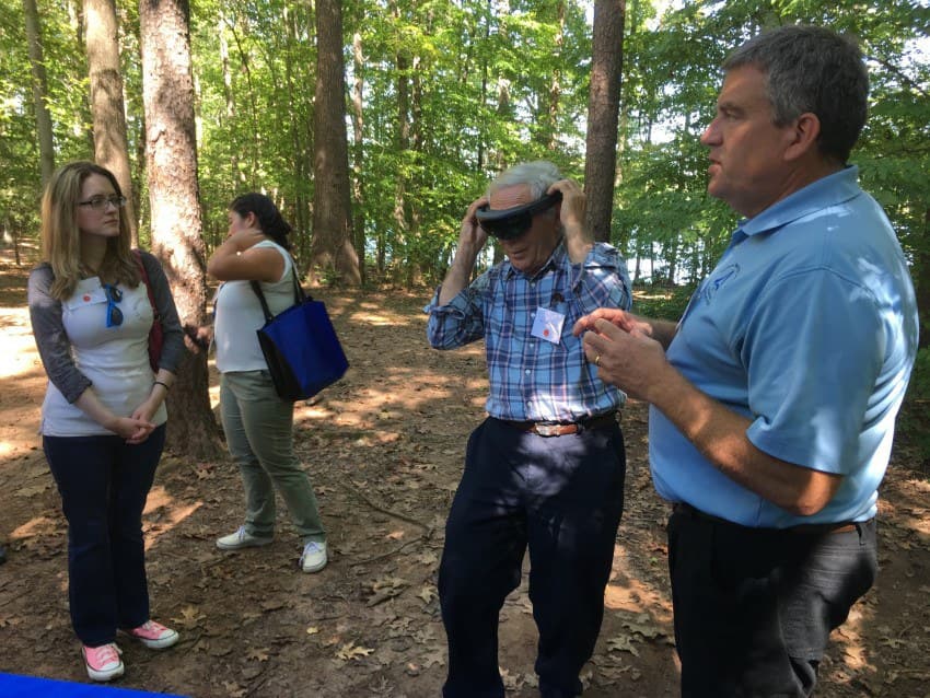 During the Capital Facilities Division’s annual picnic, Administrative Assistant Victoria Boyd and Project Manager Matt Doyle watch as Project Engineer Nikolai Dubynin views a hologram of a wastewater treatment facility through Microsoft’s HoloLens. After developing and approving administrative procedures allowing construction-management-at-risk project delivery, Fairfax County retained a contractor that’s using the technology to virtually eliminate change orders during water and wastewater facility construction. (Source: Public Works)