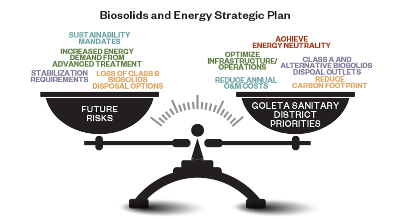 The Goleta Sanitary District (GSD) is committed to being good community stewards of public health, the environment, and public funds. This commitment includes a vision for diversifying the beneficial use of biosolids and pursuing energy self-sufficiency practices. The project aims to provide the roadmap for GSD, being a small utility (9 mgd capacity with 4 mgd AAF), to reach energy-sufficiency by reassessing their biosolids management practices in combination with various energy management approaches including maximizing digester gas generation and determining the most efficient digester gas utilization methods, along with assessing energy storage options, and other renewable energy sources.