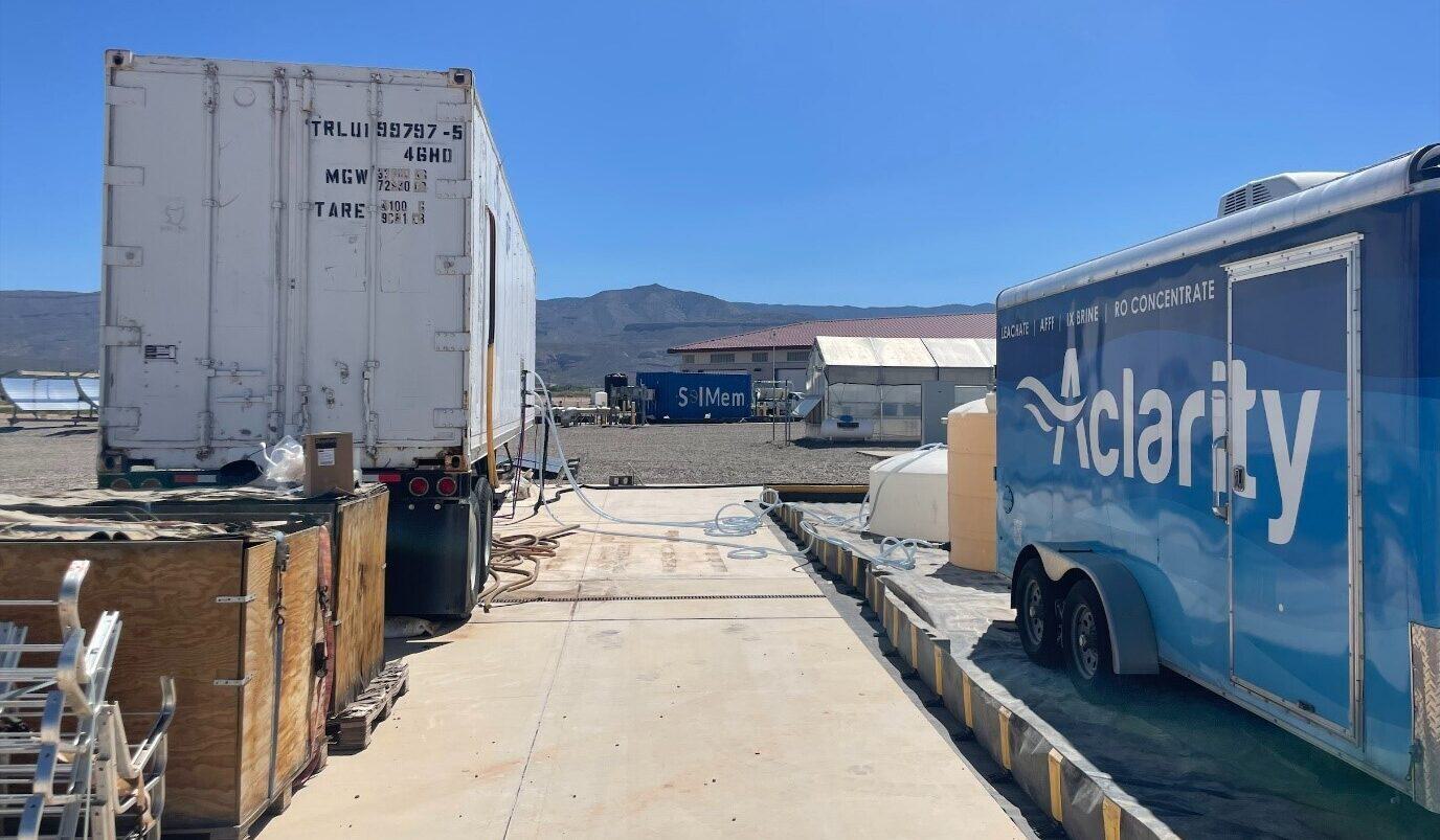 Another perspective: Aclarity trailer (right) receiving concentrated rejected brine from an NF system inside UTEP’s trailer (left).