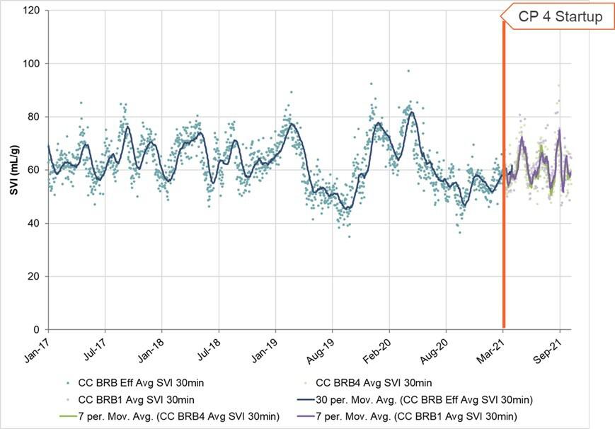 After the upgrades, the Crooked Creek WRF consistently achieved SVIs between 50-80 mL/g, within the range described as Densified Activated Sludge.