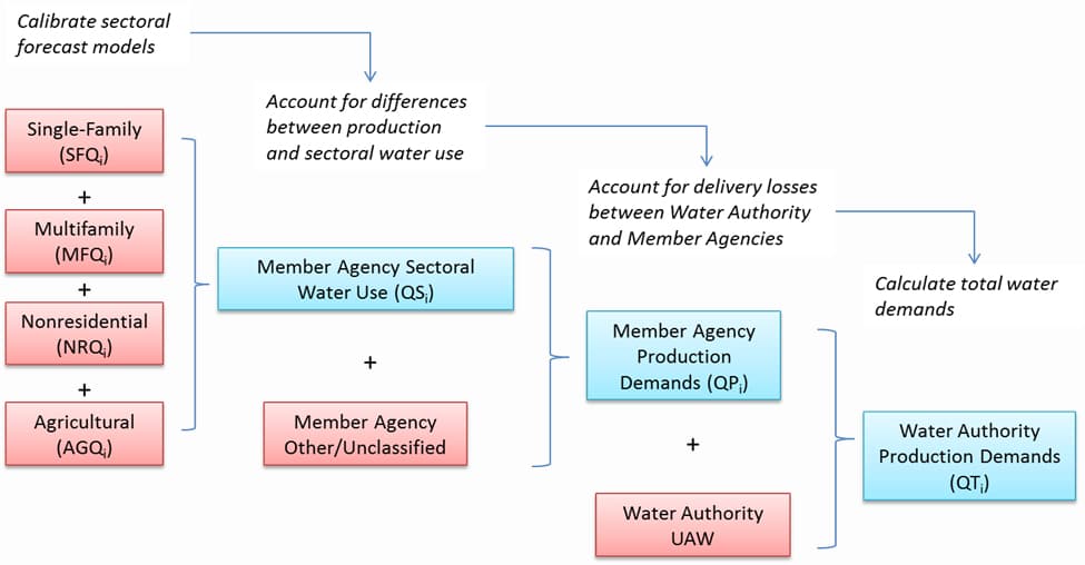 The SDCWA forecast development process consists of estimating and calibrating sectoral forecasts for each Member Agency, then estimating unbilled demands for each Member Agency from historical data for total production and sectoral demand, then estimating Authority unaccounted-for water prior to delivery to Member Agencies from historical data for total Member Agency demands and total Authority production and purchases.