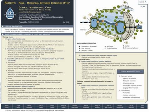 To address the varied stormwater challenges of Albany County, the County Stormwater Coalition implemented a number of best management practices (BMPs), including detention ponds, constructed wetlands, infiltration basins, bioretention cells, and vegetated swales. To ensure proper maintenance of these BMPs, Hazen and Sawyer developed general maintenance cards to provide step-by-step instruction and clear timetables.