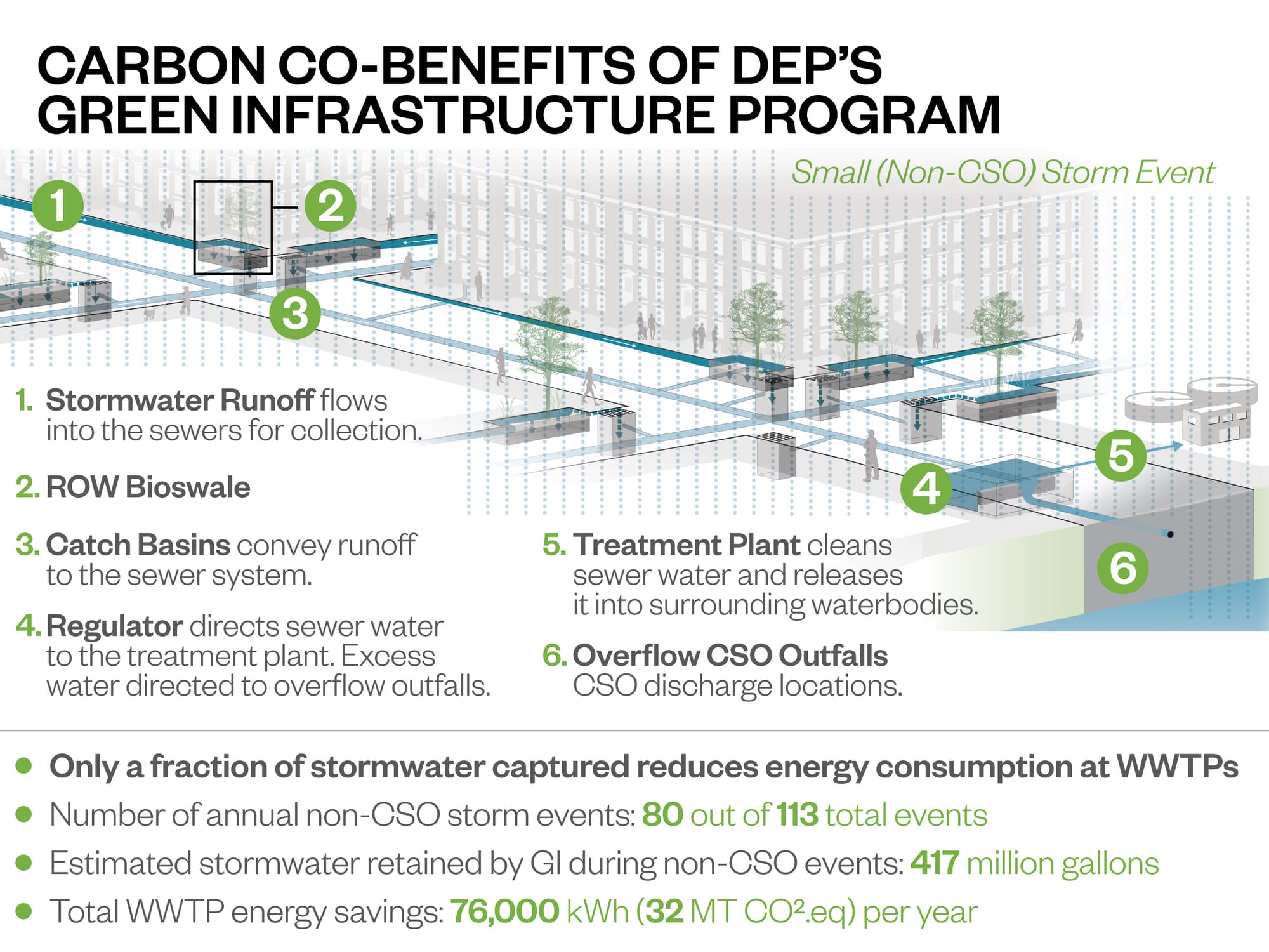 The study utilized the Global Protocol for Community Scale GHG Emissions, which requires derivation of activity data and emissions factors for each program to allow associated carbon footprints to be calculated. Sewersheds, defined as the geographic areas contributing stormwater and/or sanitary flow to each of the City’s 14 wastewater treatment plants (WWTPs), were used as modeling boundaries. An important component of the study was to understand and model the complex relationships between program activity and resultant GHG co-benefits. Activity data for fiscal year 2015 included 687 million gallons per year (MGY) of avoided stormwater input to the City’s 14 WWTPs. This stormwater was captured by green infrastructure during rainfall events that did not cause combined sewer overflows. Additionally, 528 MGY of reduced City water demand and corresponding wastewater by conserving fixtures and 133 MGY of reduced City water demand through repairs of leaking water mains. Also, direct carbon sequestration by 38 acres of installed green infrastructure and 212 acres of restored tidal and fresh water wetlands. Corresponding Emissions Factors included carbon sequestration rates by green infrastructure and restored wetlands, and electrical consumption offsets at each wastewater and water treatment plant related to flow reductions.