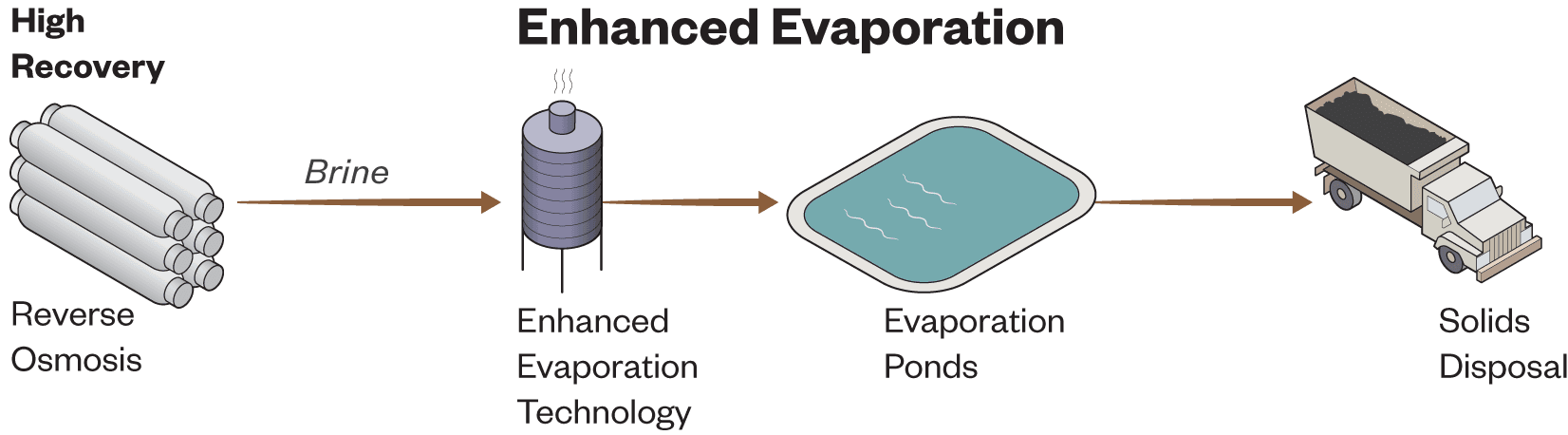The keys to the team’s solutions are twofold. First, a high-recovery RO process would produce a lower brine flow that has a higher salt concentration. Second, adding a new but proven technology that accelerates the evaporation rate in the brine ponds would significantly reduce their size.