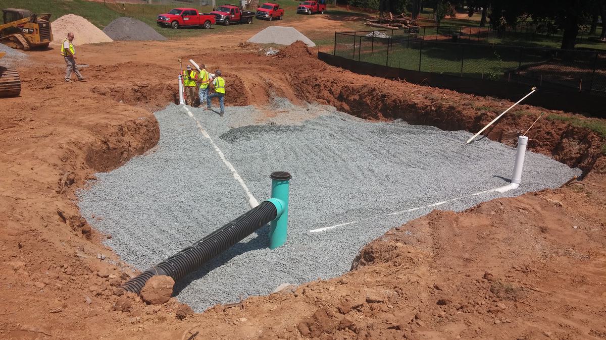 Installation of Bioretention Cell Under Drain System During Construction - Washington Park includes a fenced-in dog park run where runoff drains directly into Salem Creek. Hazen improved water quality through the bioretention construction shown above.