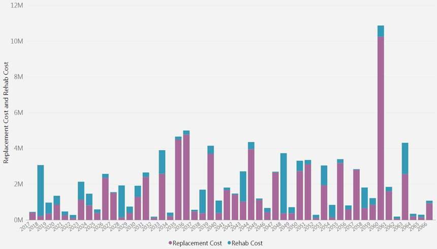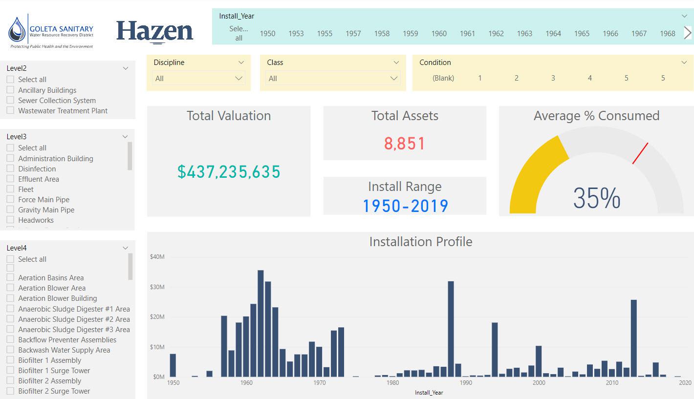 Although the project included such traditional elements of asset management as data collection, an asset register, and condition assessment, at its core was a set of customized analyses designed to inspire higher confidence in the timing and cost of asset failures and provide a tool for continuously updating asset management calculations as new data becomes available. A computerized asset management model was developed to streamline asset management calculations and visually summarize key operational and financial information in dynamic dashboards that allows the district to review data at a high level as well as "drill down" to source data.