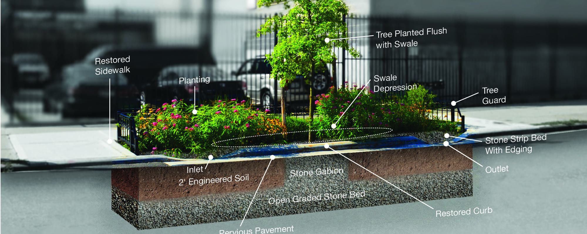 Our green infrastructure toolkit includes bioretention (rain gardens), subsurface infiltration, blue and green roofs, permeable pavement, rainwater harvesting, constructed wetlands, and more. We target "first flush" rainfall, significantly easing the burden on the sewer system and treatment facilities.
